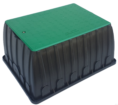 Skrzynka elektrozaworowa Jumbo o lekkiej prostokątnej konstrukcji udoskonalona o otwory do łatwego wycięcia oraz o uchwyty do podtrzymania kabli sterowniczych. Przeznaczona do montażu ziemnego zabezpiecza umieszczone w niej elementy. Zielona pokrywa idealnie wpasuje się w otoczenie każdego ogrodu. Śruba w pokrywie pozwala na szczelne zamknięcie całej obudowy.