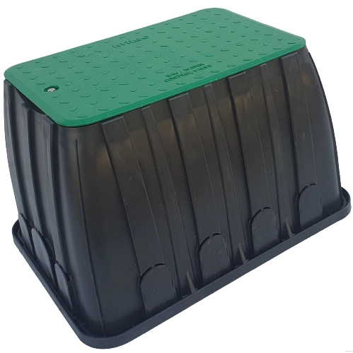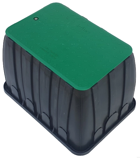 Skrzynka elektrozaworowa Standard o lekkiej prostokątnej konstrukcji udoskonalona o otwory do łatwego wycięcia oraz o uchwyty do podtrzymania kabli sterowniczych. Przeznaczona do montażu ziemnego zabezpiecza umieszczone w niej elementy. Zielona pokrywa idealnie wpasuje się w otoczenie każdego ogrodu. Śruba w pokrywie pozwala na szczelne zamknięcie całej obudowy.