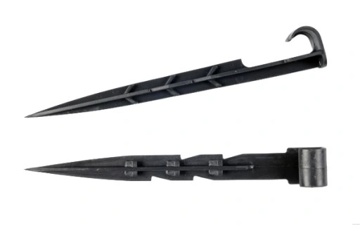 Szpilki wykonane z grubego i odpornego na złamania i promieniowanie UV tworzywa, zaprojektowane i ukształtowane tak, że linia kroplująca lub rura PE16 jest mocno i pewnie przymocowana do podłoża.
