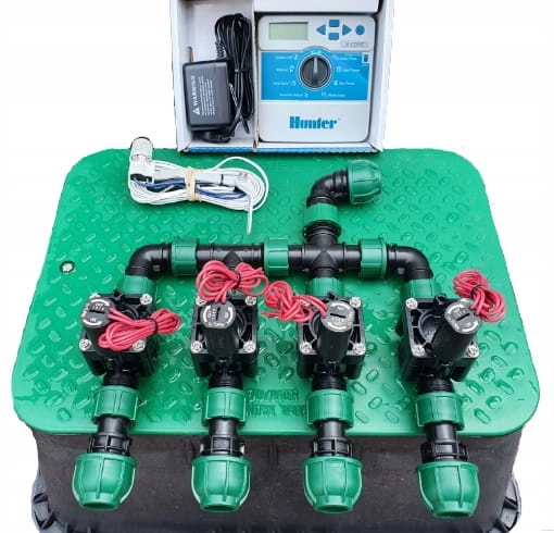 Zestaw automatycznego nawadniania ogrodu Hunter na kolektorach - 4 sekcje sterownik wewnętrzny